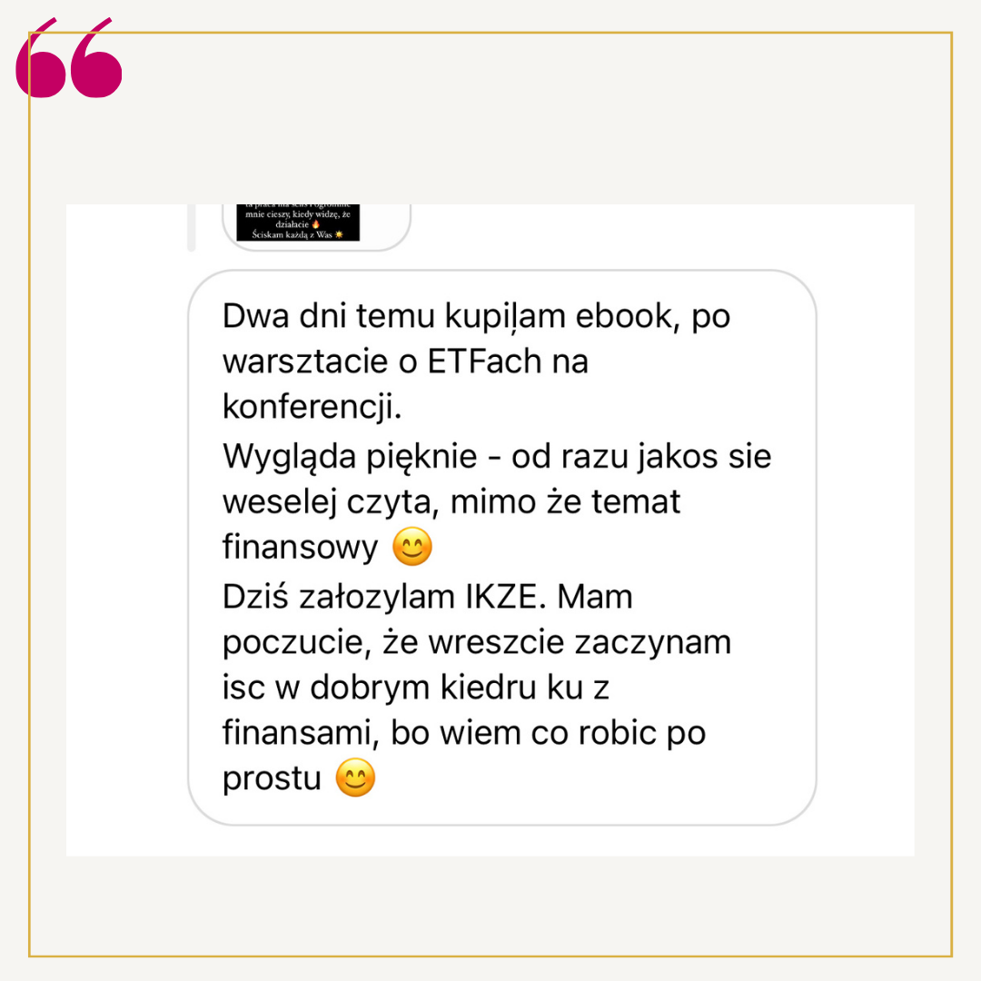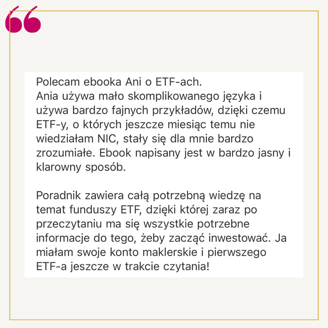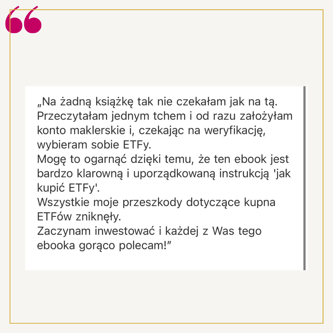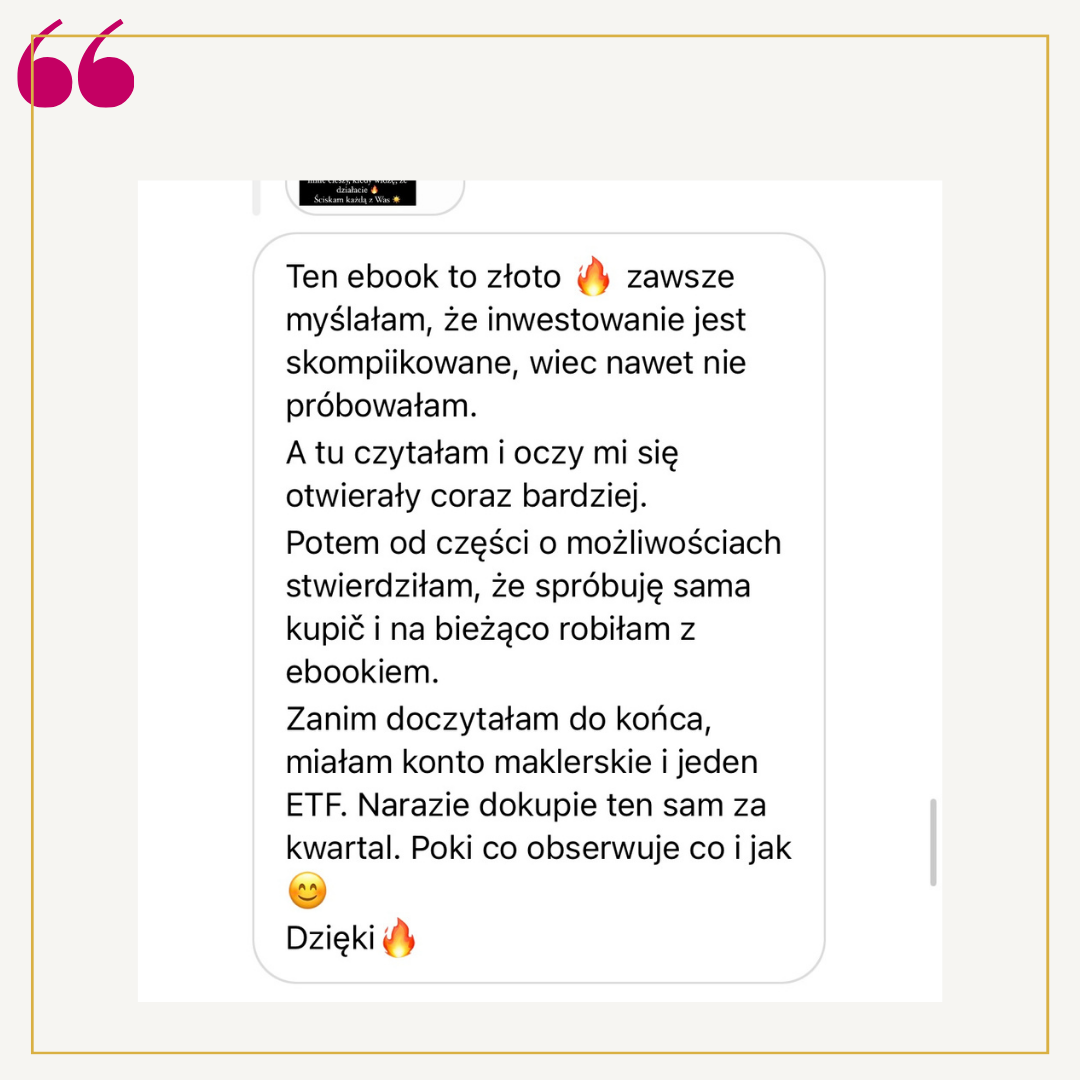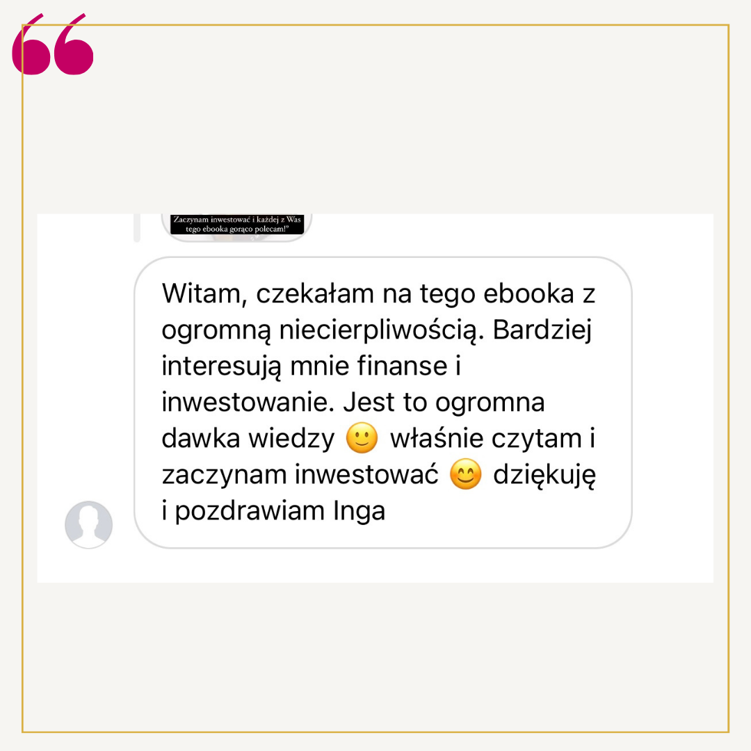Starałam się, by tekst napisany był przystępnym językiem, żebyś znalazła w nim wszystko, czego potrzebujesz do podjęcia decyzji o rozpoczęciu inwestowania i jej natychmiastowego zrealizowania. Nie znajdziesz tu bankowego bla bla bla, tylko fakty i praktyczne, gotowe do zastosowania rady.